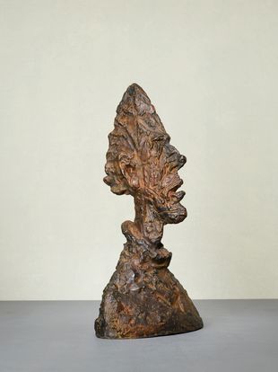 This unusually large bust of Giacometti’s brother Diego is the most pronounced example of the contrast between the wide, flat profile view and the very narrow front-on aspect. Executed in 1955, the cast has a particularly fine patina; the plaster is held in the Fondation Giacometti in Paris.