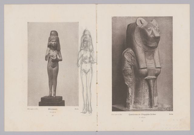 – In the side margins, plate. 19: copies after plates 18 and 19: face (front-on) and seated statue (profile) of Nofret (c. 2800 BC, Cairo) (sketchy, relatively early).