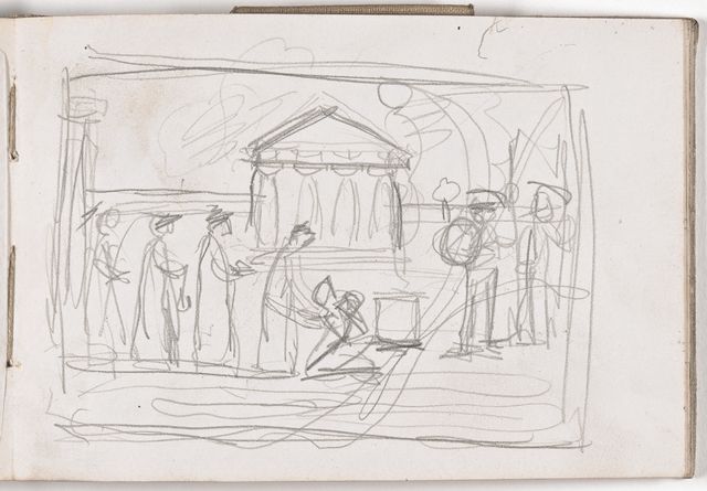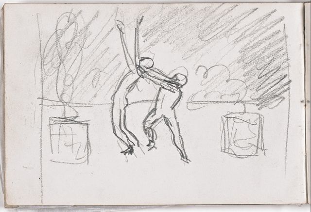Giacometti continued to work on the scenes from Greek mythology and the Old Testament that he began in Italy. A number of pages depict schematic, monumental architectures populated by tiny figures; a battle has broken out on a megalomaniac tower construction, seemingly the result of the Babylonian confusion of tongues.