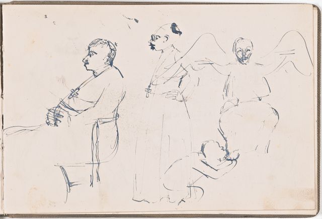 This large sketchbook dates from Giacometti’s days at the school in Schiers, which he attended from summer 1915 to spring 1919. In it he captures his classmates reading and writing, in the canteen and dormitory, taking part in evening debates of the students’ association ‘Amicitia’, sometimes with loose sketches, sometimes elaborated into meticulous compositions.