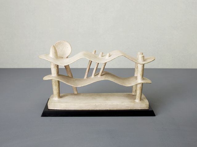The sculpture transposes the theme of the Cubist ‘Composition (Couple couché)’ into the formal type of the spatial drawing that Giacometti developed out of the disc sculptures: rather than impressing the symbols into a surface, he allows them to hover freely in the transparent space.