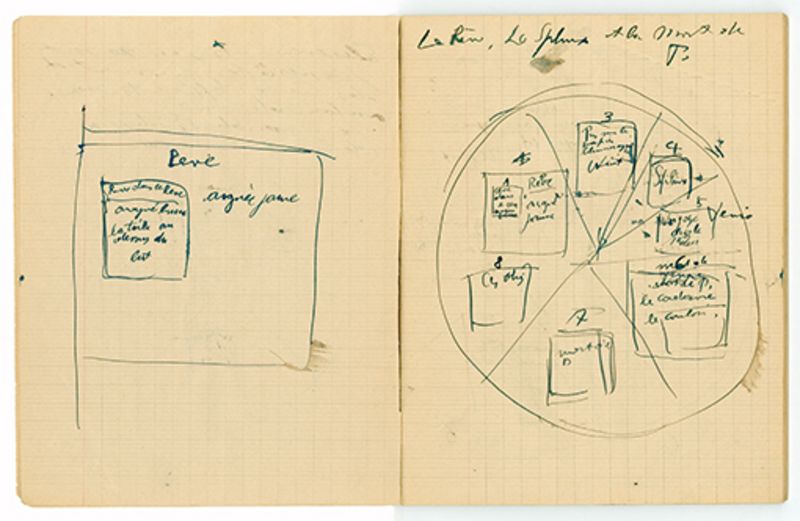 Giacometti wrote short literary texts for the Surrealist magazines, some with vignettes or as typograms, but the most important was composed in 1946 for Albert Skira’s ‘Labyrinthe’. Dreams, exaggeratedly vivid, vision-like sensations, the death of a neighbour that finally allowed him to describe the trauma of a travel companion’s abrupt demise in 1921, clamour to be depicted, but Alberto disdains any chronological sequence. He prefers to see the various episodes simultaneously and develops spatial models designed to enable that – a characteristic of the visual artist’s way of thinking and also of literary-historical significance inasmuch as it prefigures the ‘nouveau roman’. The manuscript contains a number of sketches and variants for these diagrams.