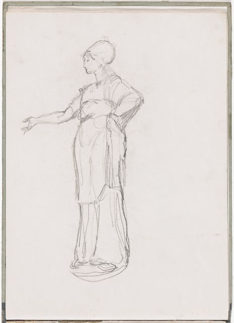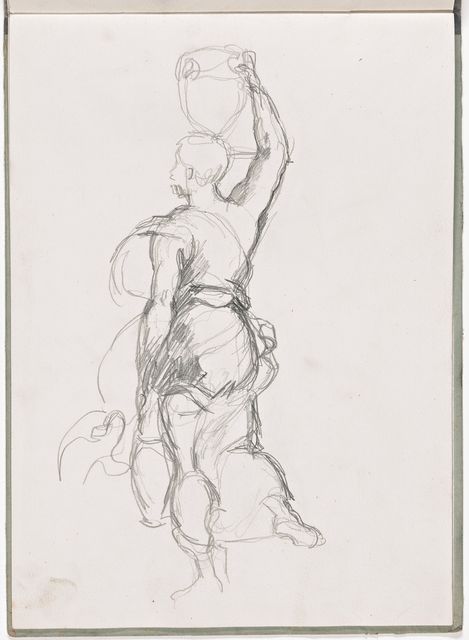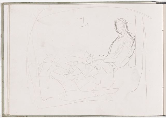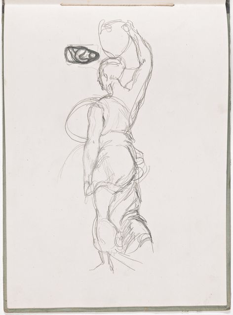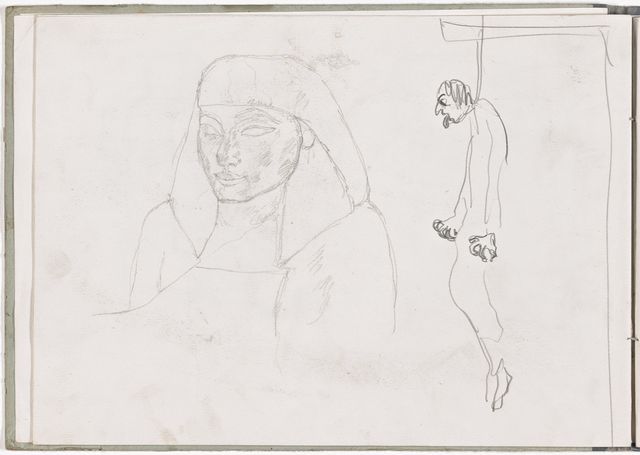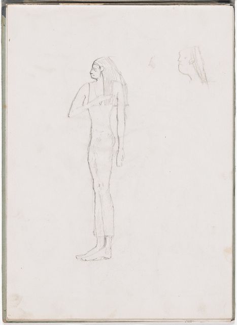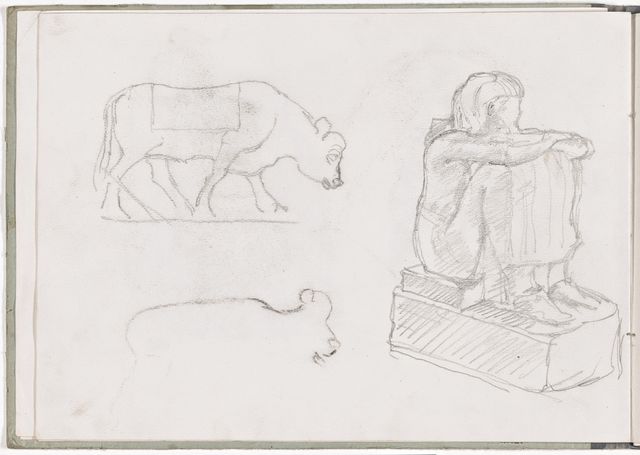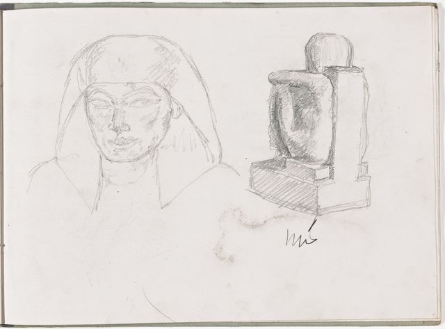 Während seinem Italienaufenthalt kauft sich Alberto ein grossformatiges Skizzenbuch und beginnt ägyptische Reliefs und Skulpturen zu kopieren, darunter eine Porträtbüste – und wie Giacometti meinte, «die erste Plastik eines Kopfes, die mich lebendig dünkte». Weitere Kopien macht er nach Fresken, Figuren aus Andrea da Firenzes allegorischer Darstellung der Theologie des Thomas von Aquin in der Spanischen Kapelle bei Santa Maria Novella, nach der berühmten Kanefore aus Raphaels «Borgobrand». Er komponiert antike Szenen, vielleicht die «Opferung Iphigeniens» und «Orest von Iphigenie in Tauris», jedoch ohne zu überzeugenden Resultaten vorzustossen.