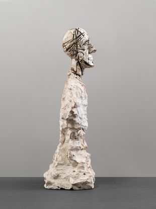 Die Büste entstand als Abguss vom Ursprungsmodell aus Ton mittels einer zweiteiligen Gipsnegativform^ (verlorene Form). Anschliessend wurde sie von Giacometti durch An- und Abtrag von Gips stark überarbeitet und mit Pinselstrichen partiell rot und schwarz bemalt.
