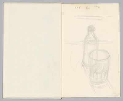 Illustriertes Buch mit einer Zeichnung auf dem vorderen Vorsatzblatt: Stillleben mit Flasche,