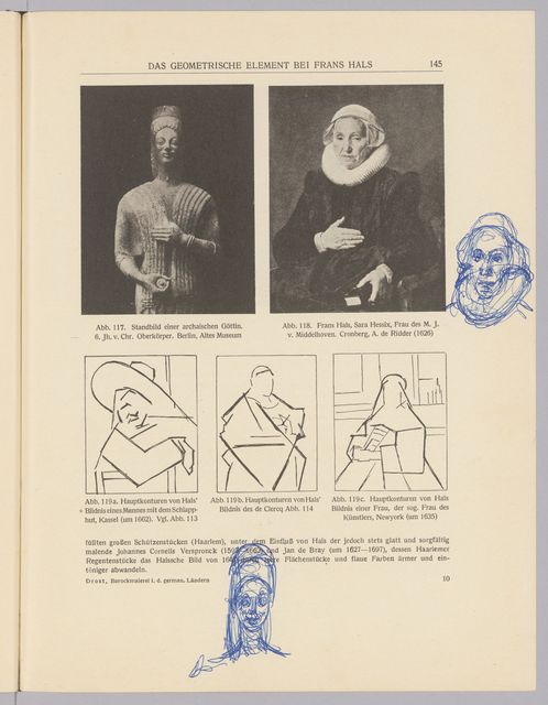 – S. 145 (Kugelschreiber): Kopien der Köpfe aus den Abb. 117 («Standbild einer archaischen Göttin, 6. Jh. v. Chr., Oberkörper, Berlin, Altes Museum») und 118 «Frans Hals: Sara Hessix, Frau des M. J. v. Middelhoven, Cronberg, A. de Ridder (1926)».