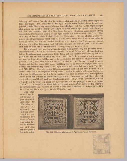 – Bleistiftskizze auf S. 409: Kopie nach dem rechten Teil der Abb. 354 «Brüstungsplatten aus S. Apollinare Nuova (Ravenna)».
