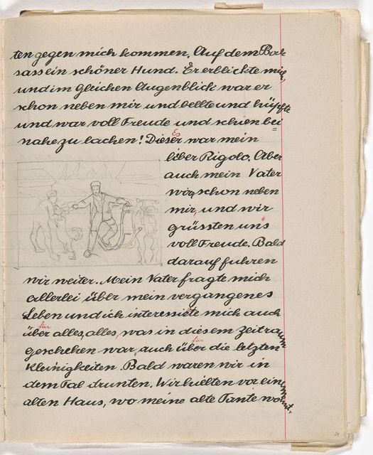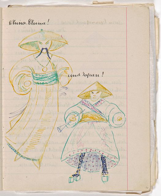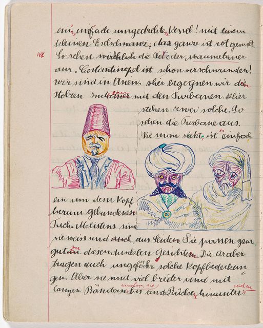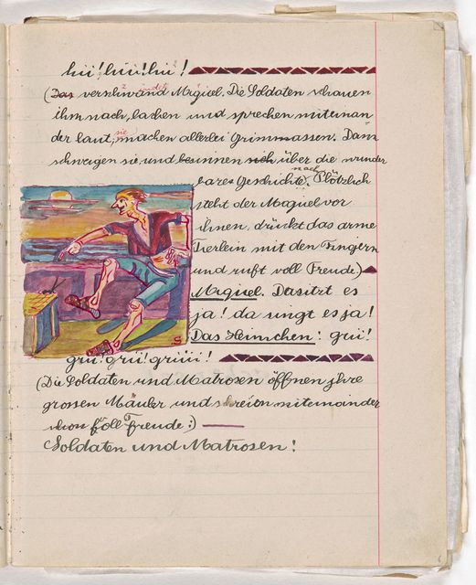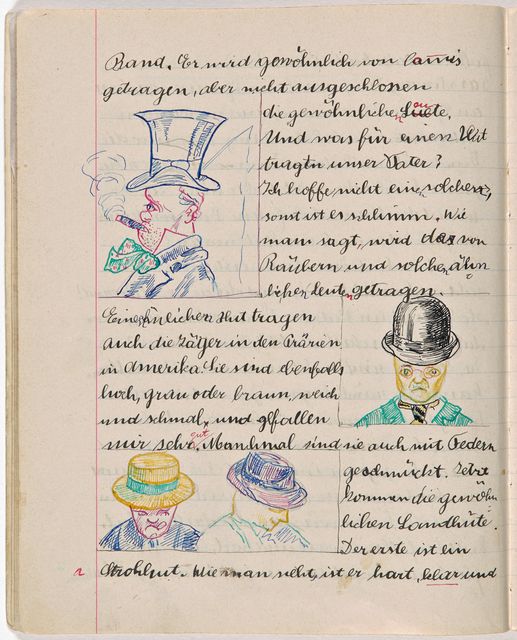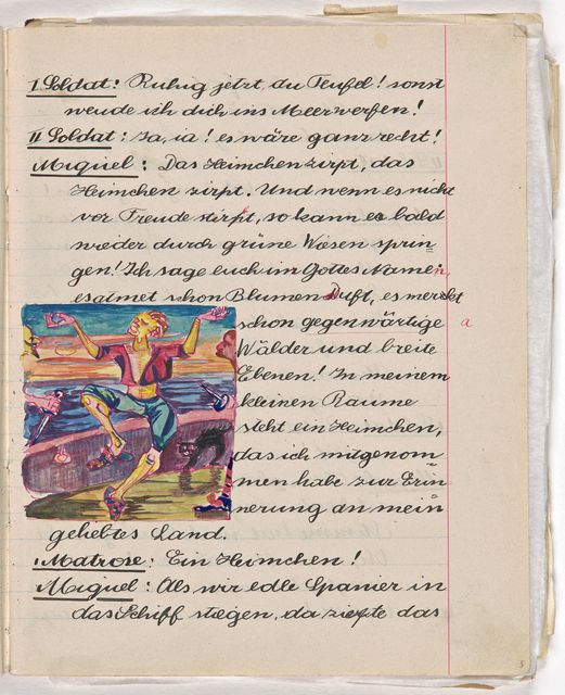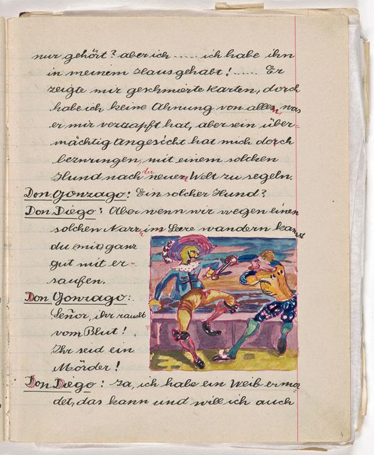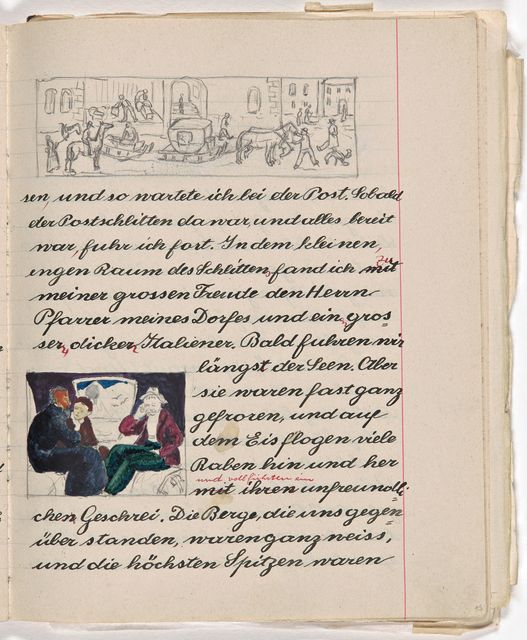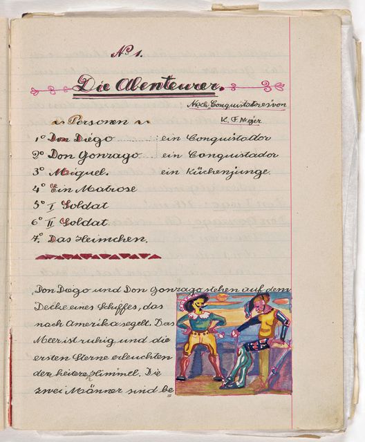 «Die Abenteurer» ist ein kleines Drama mit spanischen Haudegen; friedlicher geht es bei den schmuckreichen «Kopfbedeckungen aus aller Welt» zu. In dem Aufsatz «Wie ich zum ersten Mal nach Hause kam» greift er die friesartige Dekorationsweise auf, die sein Vater Giovanni Giacometti bei der Illustration der «Engadiner Märchen» von Bundi verwendet hatte. In den hinteren Seiten und in einen kleinen Notizheft bringt sich der Sechzehnjährige mit alterspezifischen Boxkämpfen, Mänaden und dergleichen zur Geltung.