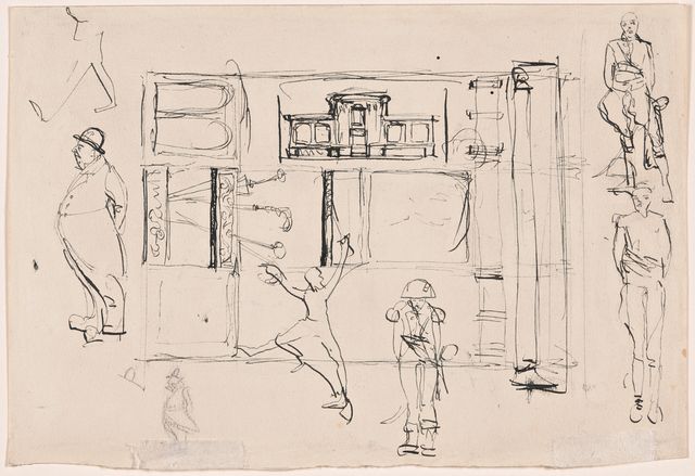 Bühnenbild mit Karikaturen, um 1916 Material Feder mit Tinte Dimensionen 19,0 x 28,0 cm Creditline Kunsthaus Zürich, Alberto Giacometti-Stiftung, 1981 Inventarnummer GS 137.verso Signatur nicht bezeichnet Provenienz