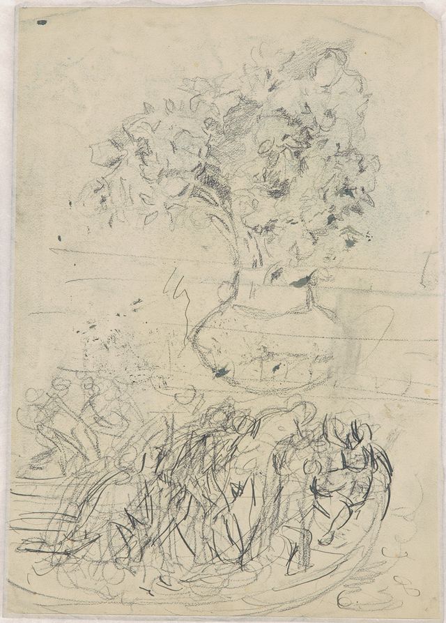 Blumenvase und Figurengruppe, 1917/18 Material Kreide auf Papier Dimensionen 36,5 x 25,8 cm Creditline Kunsthaus Zürich, Alberto Giacometti-Stiftung, 1991 Inventarnummer GS 177.verso Signatur nicht bezeichnet Provenienz