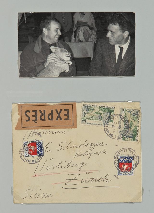 bez. auf Briefumschlag recto: Monsieur / E. Scheidegger / Photographe / Hörliberg / Zürich / Suisse; verso: Alberto Giacometti, 46 rue Hippolyte Mouindron (?). Paris XIV; 4 französische Briefmarken; auf dem schwarzen Rückseitenschutz des Rahmens u. r. mit rotem Farbstift: 11' ITALIEN - HERRLIBERG 15 KM VON ZÜRICH