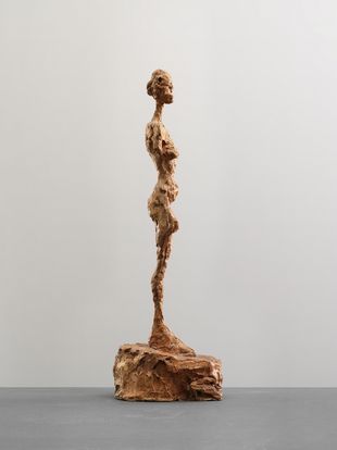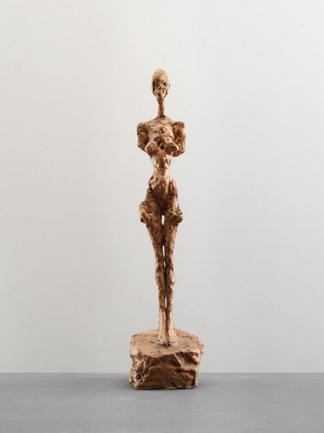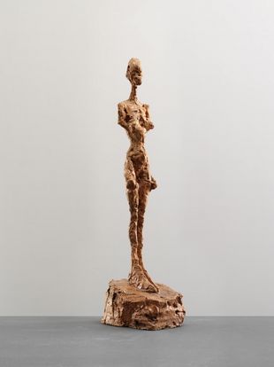 Nach dem Zusammenfügen der gegossenen Figur und des Sockels wurde die Oberfläche von Giacometti überwiegend durch Abtrag von Gips weiter überarbeitet.