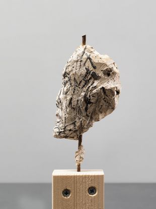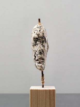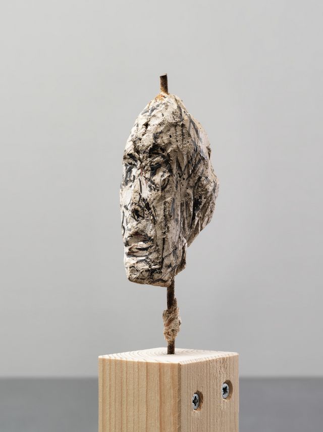 Der Kopf – vielleicht Fragment einer Figur – ist direkt in Gips auf eine Eisenarmierung modelliert. Anschliessend wurde er mit zahlreichen Pinselstrichen rot und schwarz bemalt.