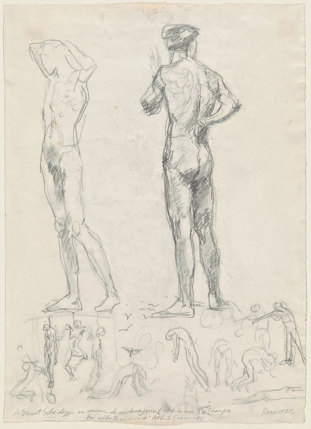 - bezeichnet in der Mitte unten, Signatur: Alberto Giacometti; bezeichnet unten rechts mit Grafitstift: Rome, 1921; unten links Widmung: A Ernst Scheidegger en souvenir de ces deux jours (et de la noce [?]) passés à Stampa. / très affectueusement Alberto Giacometti