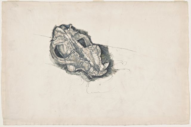 Crâne de chien , 1923/1924Hundeschädel Material Feder und Tinte mit Farbstift auf Papier Dimensionen 32,0 x 48,5 cm Creditline Kunsthaus Zürich, Alberto Giacometti-Stiftung, 2007 Inventarnummer GS 389 Signatur nicht bezeichnet Provenienz